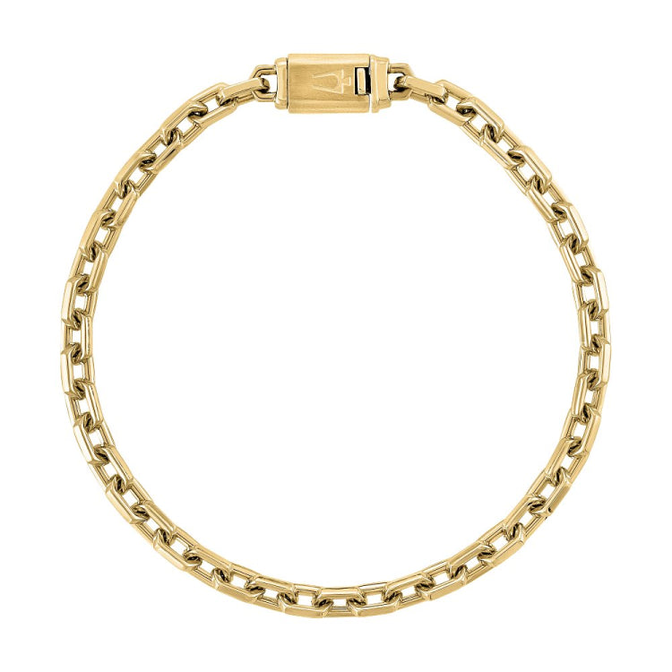 Inspired by Bulova's Icon collection, the links on this polished 5MM gold-tone stainless steel bracelet are designed in the shape of an elongated hexagon, the symbol for harmony, structure and balance. Makes a stylish stand-alone piece or perfect for a layered look. Hexagon cable bracelet measures 8" in length and features a matte finish box clasp etched with Bulova's iconic tuning fork logo.