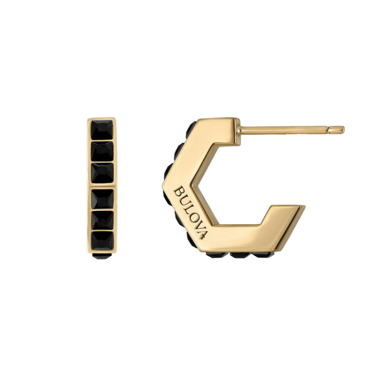 Inspired by Bulova's Precisionist bolt, these C-hoop earrings are designed in the shape of an open hexagon, the symbol for harmony, structure and balance. Inlaid with faceted black spinel, a rare gemstone believed to repel negativity while providing inspiration and empowerment. Made of gold-tone stainless steel and measures 14MM in length.