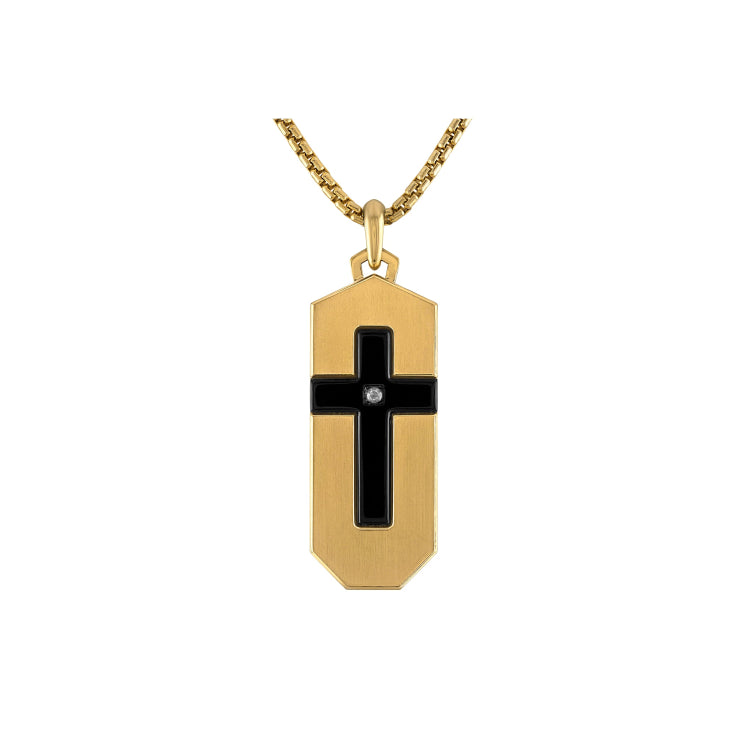 An elongated dog tag pendant in a striking dual combination of black and gold-tone stainless steel. Bold cross inlay features a center white diamond 0.03 CTTW. Rounded box link chain necklace in gold-tone stainless steel adjusts from 24" to 26" with extender ring and tuning fork shaped clasp. Pendant measures 42MM L x 17MM W.