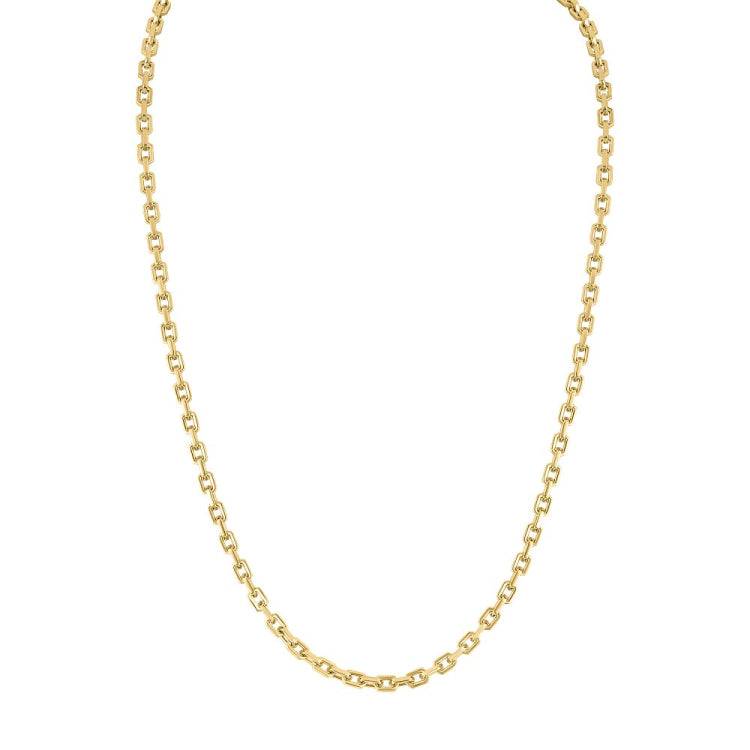 Inspired by Bulova's Icon collection, the links on this polished 5MM gold-tone stainless steel necklace are designed in the shape of an elongated hexagon, the symbol for harmony, structure and balance. Makes a stylish stand-alone piece or perfect for a layered look. Hexagon cable chain measures 24" in length and features a matte finish box clasp etched with Bulova's iconic tuning fork logo.