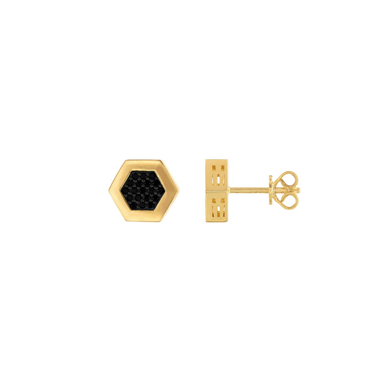 Stud earrings designed in the shape of a hexagon, the symbol for harmony, structure and balance. Made of 14K yellow gold-plated sterling silver inlaid with black diamonds totaling 0.38 CTTW and cutout designs on all six sides, they secure comfortably with friction backs. Measures 10MM in diameter.