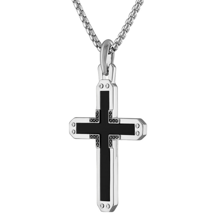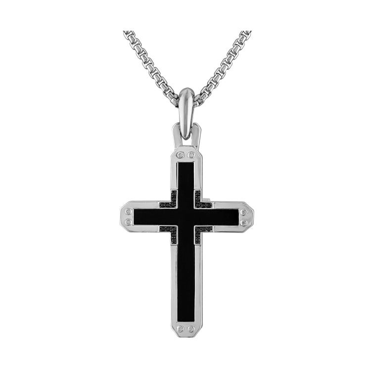 Cross pendant made of rhodium-plated sterling silver prominently features black onyx, a semi-precious stone of protection, believed to promote physical strength and stamina. The inside corners of the cross are accented with black diamonds totaling 0.10 CTTW. Rounded box link chain necklace in sterling silver adjusts from 24" to 26" with extender ring and pear shaped lobster clasp. Pendant measures 40 MM L x 30 MM W.