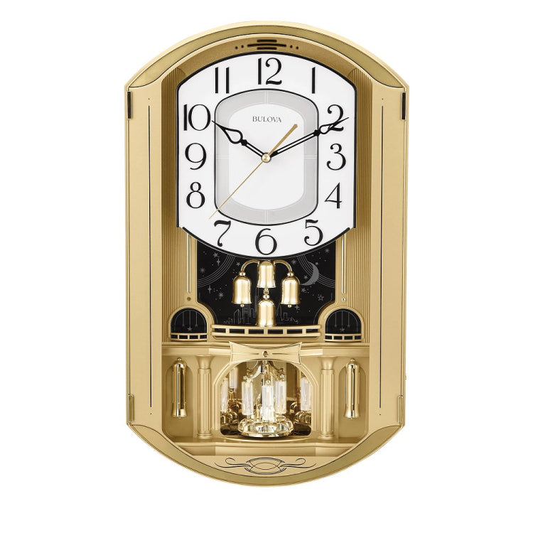 Add a luxurious musical dimension to your wall. Listen to 12 different melodies playing progressively on the hour. * A classically styled rectangular gold-tone-finish molded case, rotating pendulum has super clear K-9 crystal elements that reflect and sparkle in the light. A separate pendulum with 3 bells swings under the dial for added motion. A practical side-facing on-demand button gives you the option to listen to the song selection at any time. Adjustable volume control and automatic night shutoff are added features. Protective glass lens. (*12 traditional favorites include: Waltz of the Flowers, Twinkle Twinkle little Star, Green Sleeves, The Blu Danube, For Alice, Waltz, Beautiful Dreamer, Hayden Serenade Schubert, Wings of Songs, Liebestraun # 3 , Rockabye Baby).