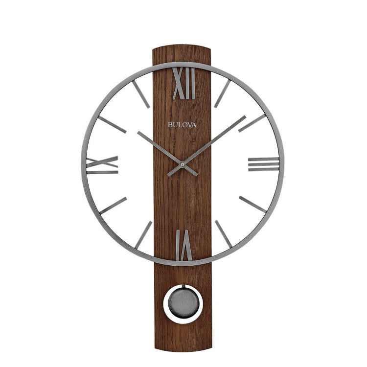 Walnut finished Ash veneer and hardwood case with curved top and bottom to match the the Pewter finished “Floating” Roman numeral dial with a 65 MM aged pewter finished SLO SWING pendulum gracefully that moves back and forth through a peek a boo lower opening .
