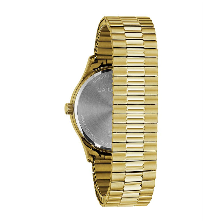 Timeless design, wear-with-everything style. Complete with easy-to-read bold 24-hour design and three-hand date feature on matte white dial. Gold-tone stainless steel case and comfort-fit expansion bracelet are the finishing touches on this classic watch.