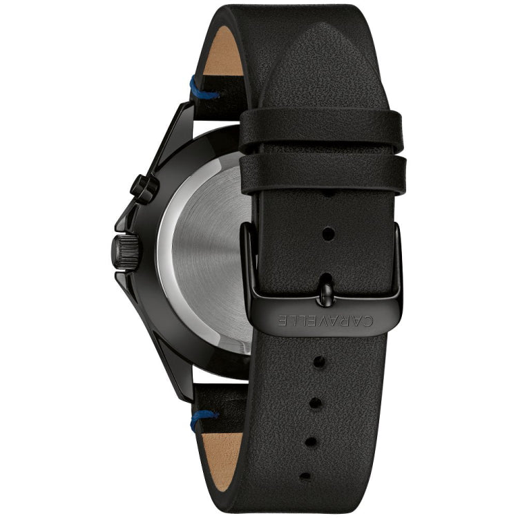 Clean, contemporary everyday style. Black IP stainless steel case with a blue dial has a backlit feature that illuminates the dial and is activated with a pusher at 2 o’clock. It also features a day/date window, luminous hands and a contrast second hand. A black leather strap with contrast stitching completes the look. * Case Diameter: 40mm * Case Thickness: 10.6mm * Water Resistance: 30M * 3-Year Limited Warranty