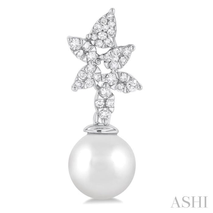 A dreamy pair of pearl and diamond earrings from the magnificent lovebright collection, these draw instant attention. The earrings feature a scattered 6-leaf motif, with a round 8 MM cultured white pearl suspended from the tip of the base leaf. Pear shape mounts make up the leaf motif and are embellished with round cut diamonds. There is a total of 68 invisible set round cut diamonds decorating the pear mounts, 34 diamonds on each earring. The Lovebright pearl and diamond earrings is sculpted in a polished rhodium finish 14 karat white gold. Total diamond weight is 3/8 Ctw.
