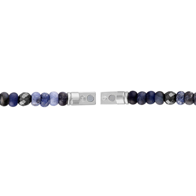 Beaded bracelet 8.5" in length made of sodalite, also known as the poet's stone, in varying shades of blue, is believed to emanate a soothing and calming energy. Accented throughout with faceted hematite beads (thought to promote stability and optimism) and crafted with a magnetic cylinder clasp in sterling silver. All of our sterling silver is rhodium plated to give the jewelry a brilliant shine and provide enhanced durability.
