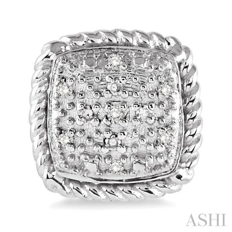 A modern and sophisticated design, these earrings are a great look for her ears. Fashioned in sleek sterling silver, these square shaped stud features a cluster of 14 prong set shimmering single cut diamonds at its center engrossed by a bright finish rope design on the border. The total diamond weight is 1/20 ctw.