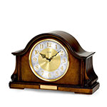 Solid wood and wood veneer case, Old World walnut finish. Brass-finish diamond-cut metal bezel. Two-tone metal dial with raised numerals. Harmonic 2 triple-chime movement plays choice of Westminster, Ave Maria or Bim-Bam melody on the hour. Quarter-hour Westminster chime and strike available. Adjustable volume control. Automatic night shutoff switch available. Convex glass lens. Requires (1) AA, (2) C batteries, not included. Engraving plate included: 2.5" x .5", 6.35cm x 1.27cm
