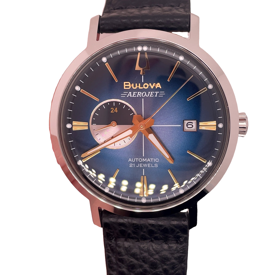 BULOVA’S NEW AUTOMATIC MODELS IN THE AEROJET LINE BRING A CONTEMPORARY FLAIR TO THIS CLASSIC LUXURY WATCH INSPIRED BY VINTAGE TIMEPIECES. THE STRIKING SUNRAY BLUE DIAL INCLUDES GOLD-TONE ACCENTS AND A BI-COLOR DAY/NIGHT INDICATOR. THE SIGNATURE CROSS-HAIR DETAIL IS ENHANCED WITH AN OMBRE EFFECT RADIATING FROM A PALE COLOR AT THE CENTER TO A RICH DARK BLUE AT THE EDGES. THE VINTAGE AEROJET LOGO ADDS AN AUTHENTIC RETRO FEEL TO THE TIMEPIECE. THE CASE IS STAINLESS STEEL, WITH A SCREW-BACK FEATURING A MINERAL CRYSTAL EXHIBITION WINDOW. THE LOOK IS ENHANCED WITH A SUPPLE BLACK LEATHER STRAP FOR A RICH ELEGANCE THAT WILL STAND OUT.