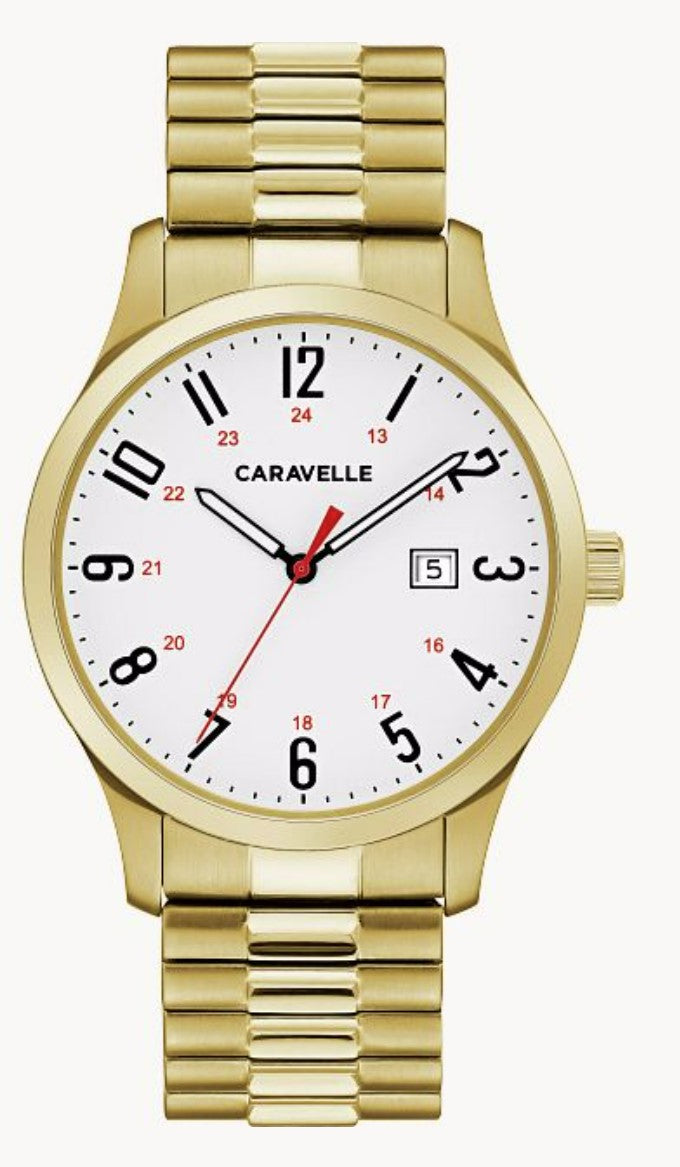 CARAVELLE BY BULOVA YELLOW WATCH, WHITE DIAL, BLACK AND RED DIAL, EXPANSION BAND DATE