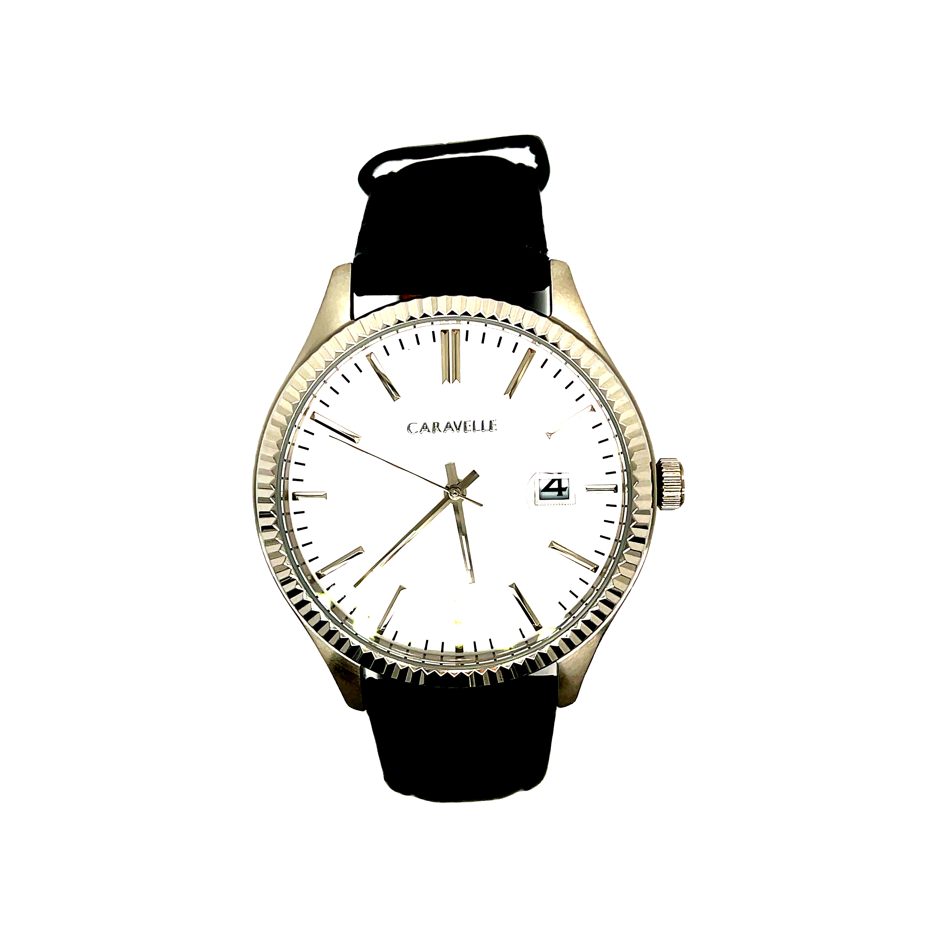 CARAVELLE BY BULOVA DRESS ELEGANT AND PERFECTLY REFINED DESCRIBE THIS GRAPHIC WHITE DIAL, THREE-HAND STAINLESS STEEL WATCH. FEATURING A TEXTURED BEZEL DETAIL, DATE MAGNIFIER AND BLACK CROC-EMBOSSED LEATHER STRAP WITH BUCKLE CLOSURE.