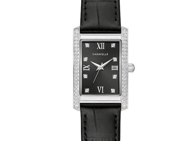 LADIES CARAVELLE BY BULOVA WATCH BLACK DIAL WITH CRYSTALS AND WHITE ROMAN NUMBERS AND BLACK LEATHER STRAP