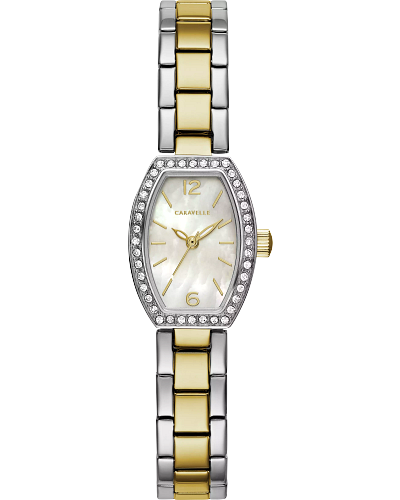 CARAVELLE BY BULOVA DRESS ADD A SPARKLE TO YOUR STYLE. 40 BRILLIANT CRYSTALS EMBELLISH A GOLD-TONE STAINLESS STEEL CASE. SILVER-WHITE MOTHER-OF-PEARL DIAL. GOLD-TONE ACCENTS ON STAINLESS STEEL BRACELET WITH JEWELERS CLASP CLOSURE.