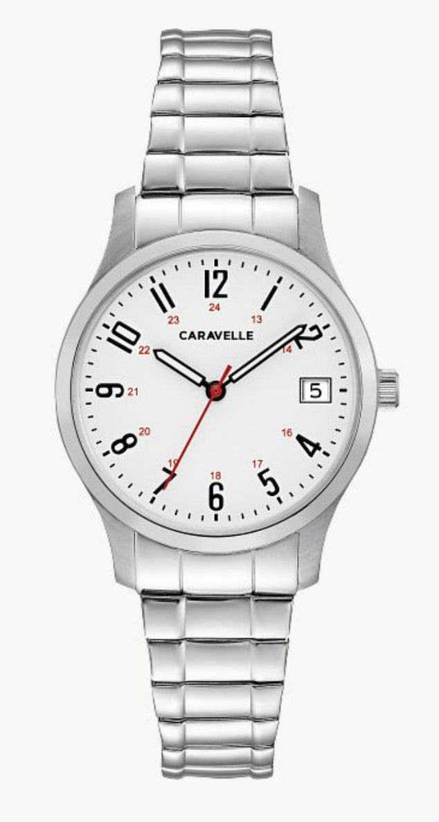 LADIES CARAVELLE WATCH, WHITE, STRETCH BAND, WHITE DIAL, DATW
