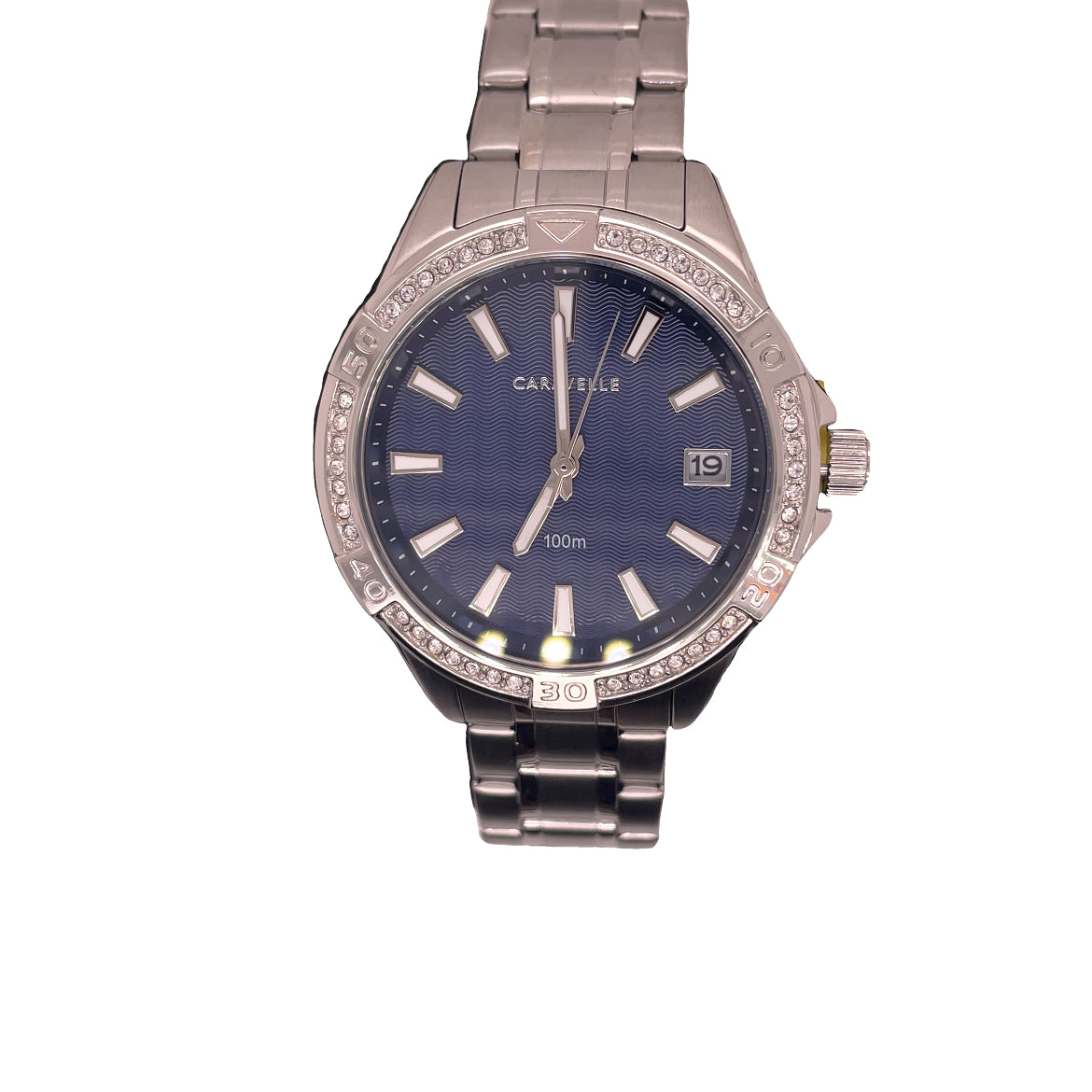 LADIES CARAVELLE WATCH BY BULOVA WHITE, CRYSTALS, AND BLUE DIAL WITH DATE